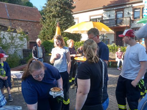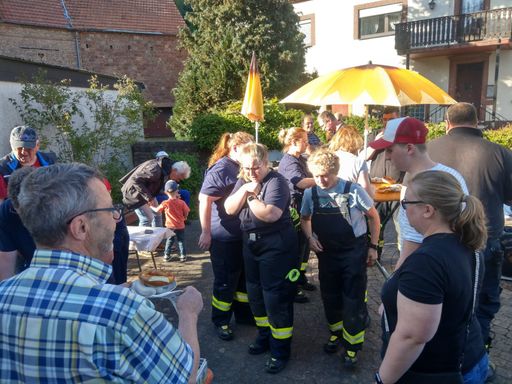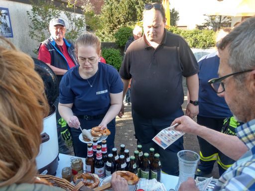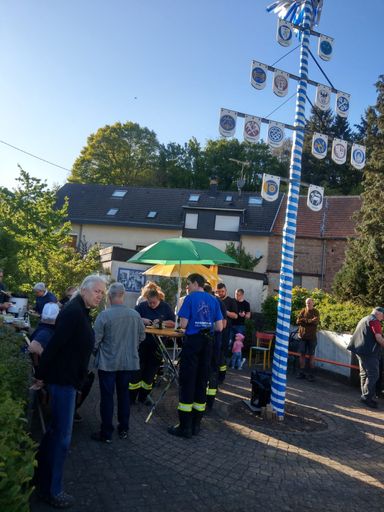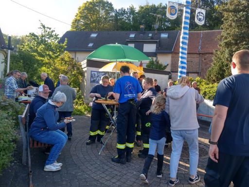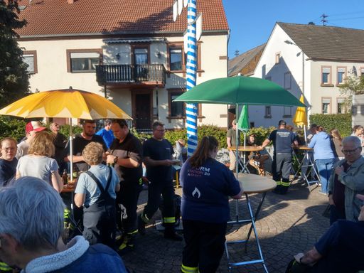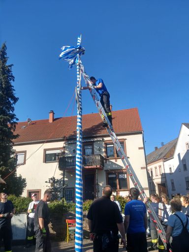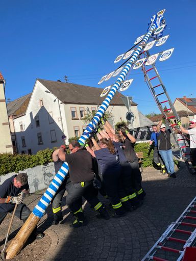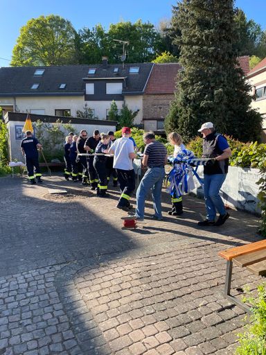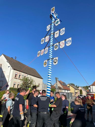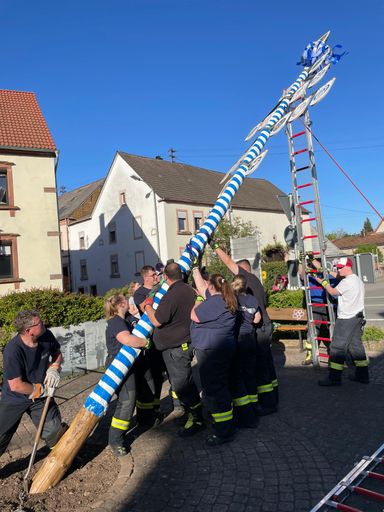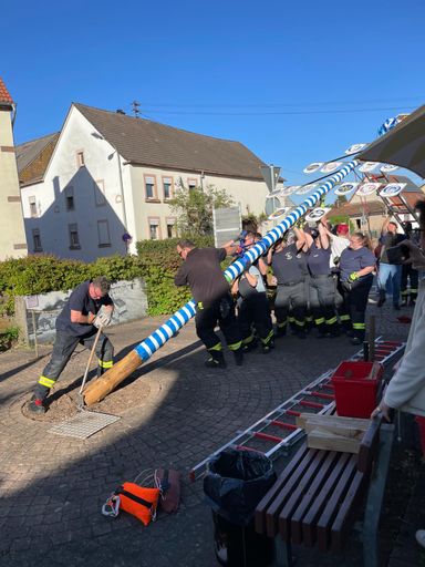 Die Bankräuber wollen schon immer hoch hinaus, doch für diese Aufgabe ist es besser erfahrene Hilfe zu erhalten. Die freiwillige Feuerwehr half gerne, den Zunftbaum aus seinem Standloch zu ziehen und umzulegen. Vor allem das hochkomplexe Gerät für die Abstützung beim Umlegen des Zunftbaumes war sehr hilfreich.