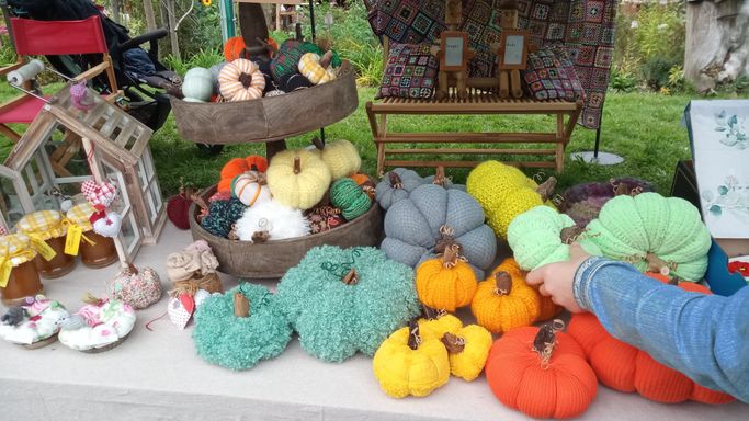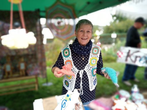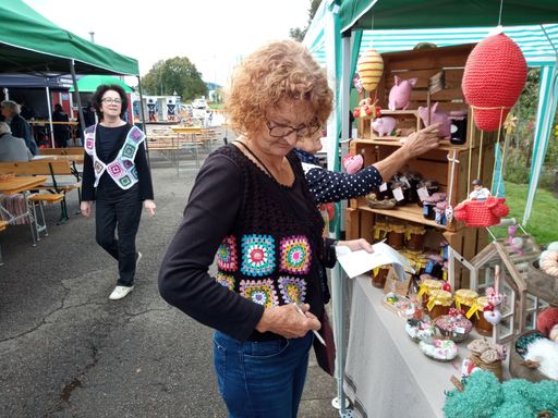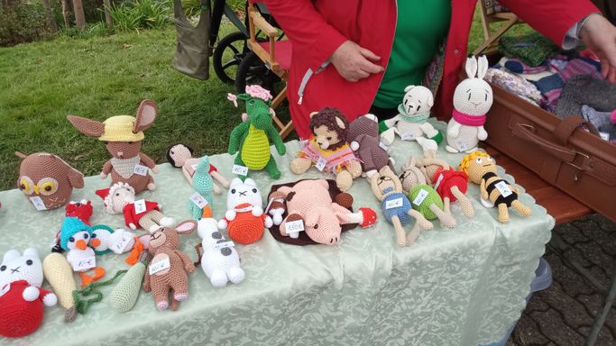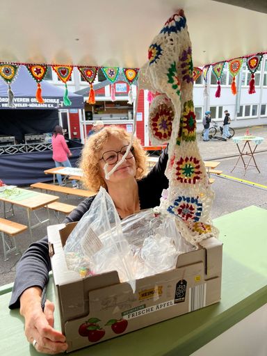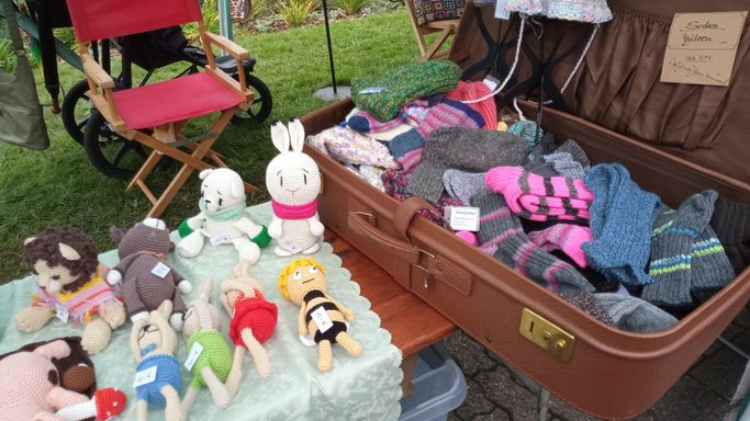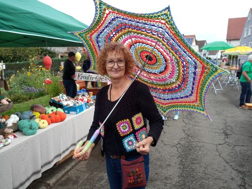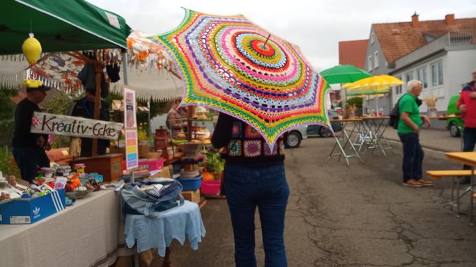 Als besonderen Gag haben sich die Damen vom Heimatverein vorgenommen, die Idee der Granny Square weiterzuspinnen und andere Artikel zu häkeln. Am Ackerfest wurden alle päsentiert.