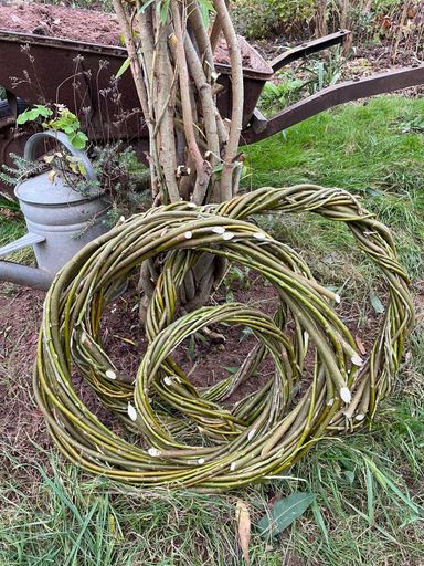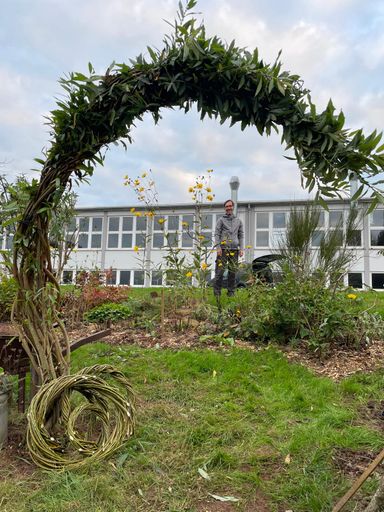 Die Weidenruten wurden gleich in Kränze gebunden, solange sie noch weich und elastisch sind. Im nächsten Jahr werden das prima Träger für jahreszeitliche Schmuckgebinde. Auch wenn die Natur langsam in Winterschlaf geht, der überdachte Freisitz am Platz der Vielfalt steht weiterhin jedem als Versperplatz zur Verfügung.