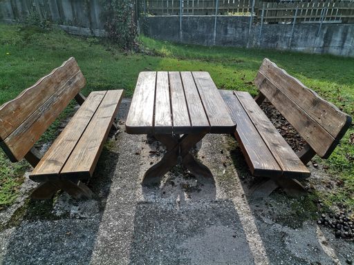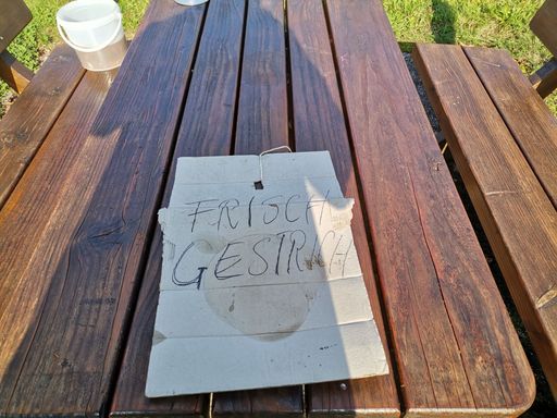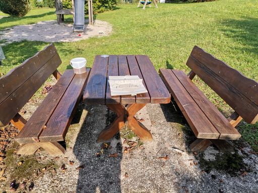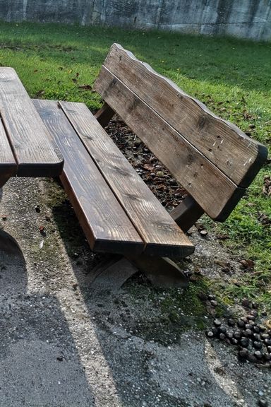 Die Tisch-Bänke Garnitur am Spielplatz im Hechtloch wurde von einer Vielzahl von Kastanien überfallen, begleitet von der Holzverrottung, Flechtenbefall und Vogelkot. Eine echte Notlage für die Holz-Garnitur.