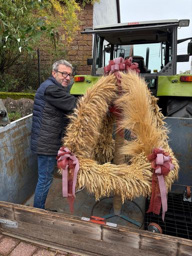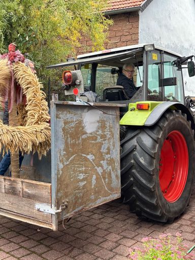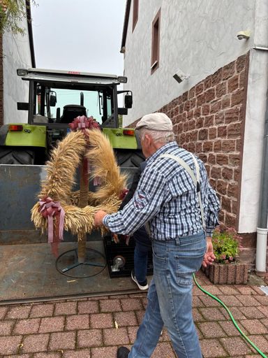 Unsere Erntekrone wird mit schwerem Gerät vom Presbyter Kurt vom Platz der Vielfalt abgeholt.