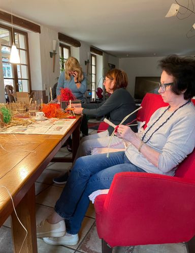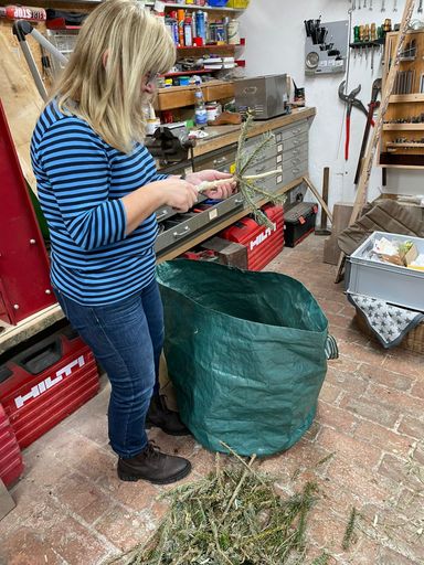 Dem Heimatverein liegt nicht nur die Pflege der natürlichen pflanzlichen Umwelt am Herzen, auch die Tiere, von den Insekten bis zu den Wildvögeln, gehören dazu. Unsere kreativen Damen haben immer wieder Ideen etwas aus dem Rahmen gefallenes zu gestalten. Ein Blick in die Werkstatt zeigt was man aus Weihnachtsbaumspitzen und Drahtkleiderbügel herstellen kann. kann. Mit natürlichem Bast bespannt, entsteht ein hübscher, nützlicher und nachhaltiger Wildvogelfütterungsapparat. Den nachhaltigen Meisenknödelhalterproduktionvorgang sehen sie an den Bildern unseres Bastelteams.