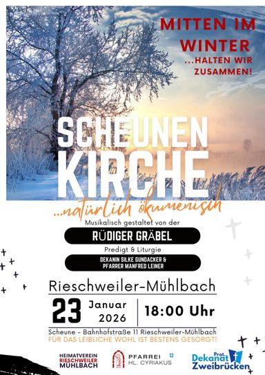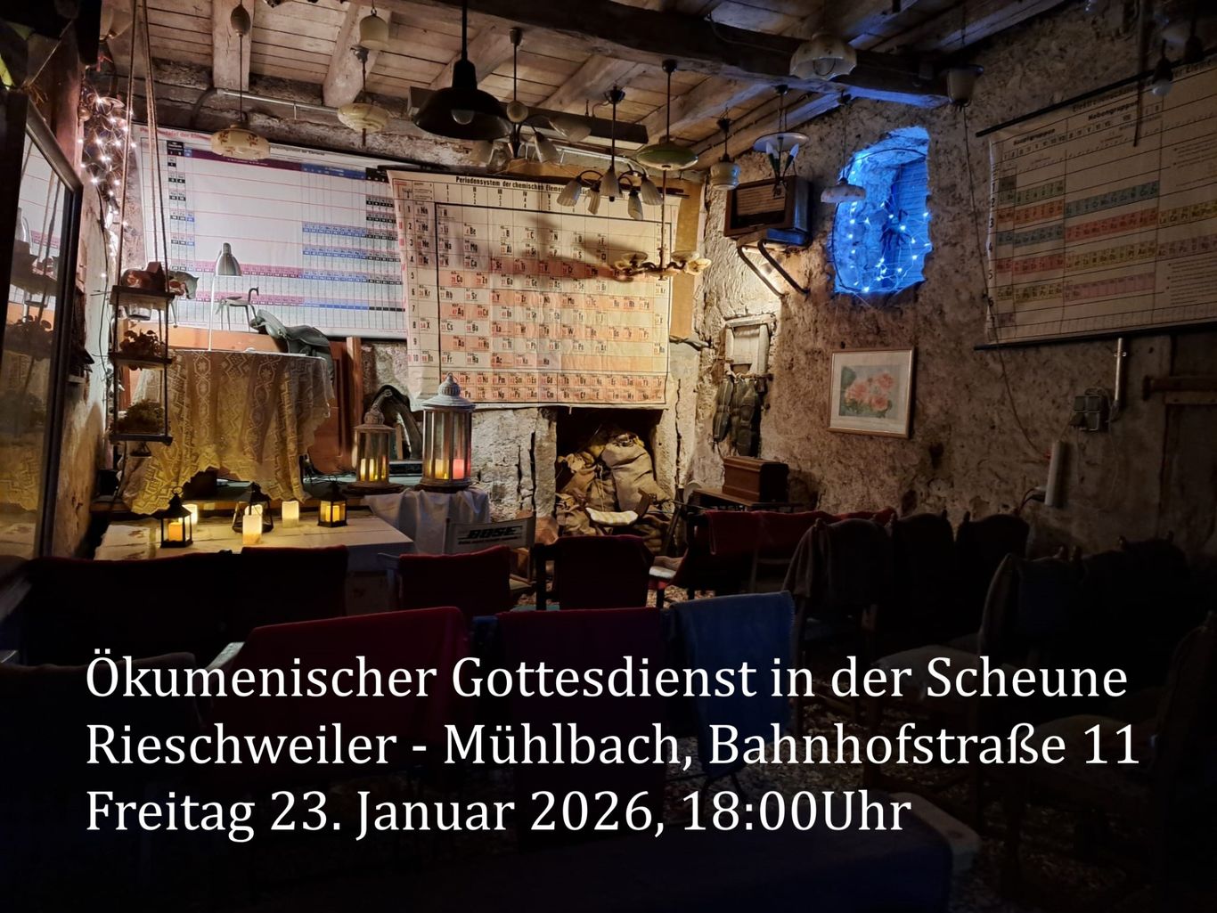 Auch 2026 beginnen wir das Jahr mit einem ökumenischen Gottesdienst für Menschen aller Konfessionen. In der Scheune von Pollersch Hof, in Rieschweiler-Mühlbach, Bahnhofstrasse 11, haben die Helfer vom Heimatverein am Freitag den 23 .01.2026 18:00 Uhr alles für einen stimmungsvollen Abend vorbereitet. Einlass ab 17:30 Uhr.