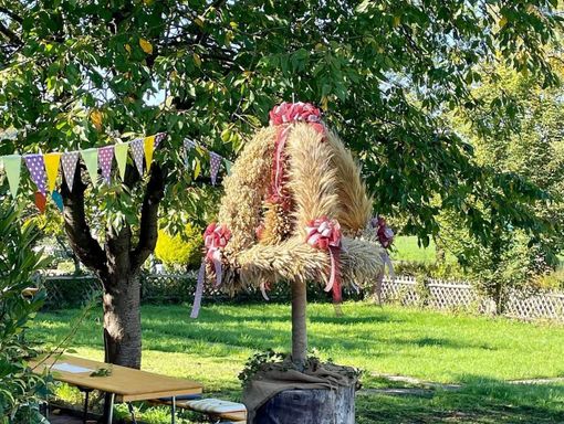 In der Kirche schmückt die Erntekrone die Feierlichkeiten zum Erntedankfest.