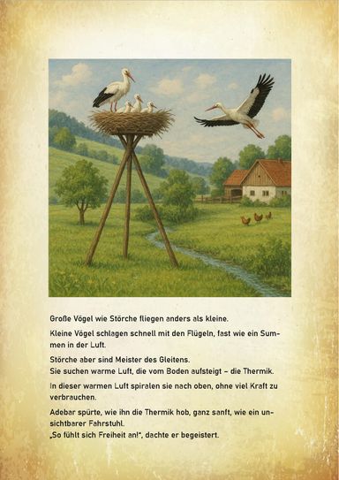 Dieses liebevoll erzählte Kinderbuch begleitet Adebar und seine Familie durch Frühling, Sommer und die erste große Reise der Jungstörche.