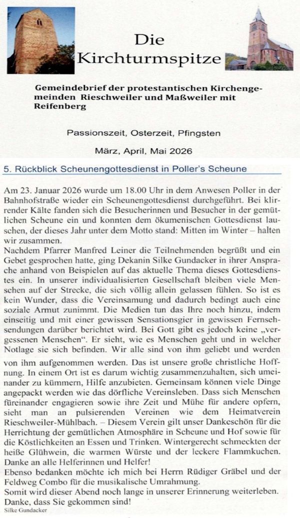 Der ökumenische Gottesdienst wurde von Dekanin Silke Gundacker und Pfarrer Manfred Leiner gehalten. Mit einer ansprechenden und sehr passenden Ansprache der Dekanin Gundacker traf Sie genau unsere Sorgen in der momentanen Zeit! Auch Pfarrer Leiner fand die richtigen Worte zum Thema: Mitten im Winter .. halten wir zusammen. Wirklich treffende Worte, die Mut machen und Zuversicht geben, und anregen in der Gemeinschaft zusammenzuhalten. Rüdiger Gräbel und die Feldweg Combo begleiteten den Gottesdienst musikalisch.