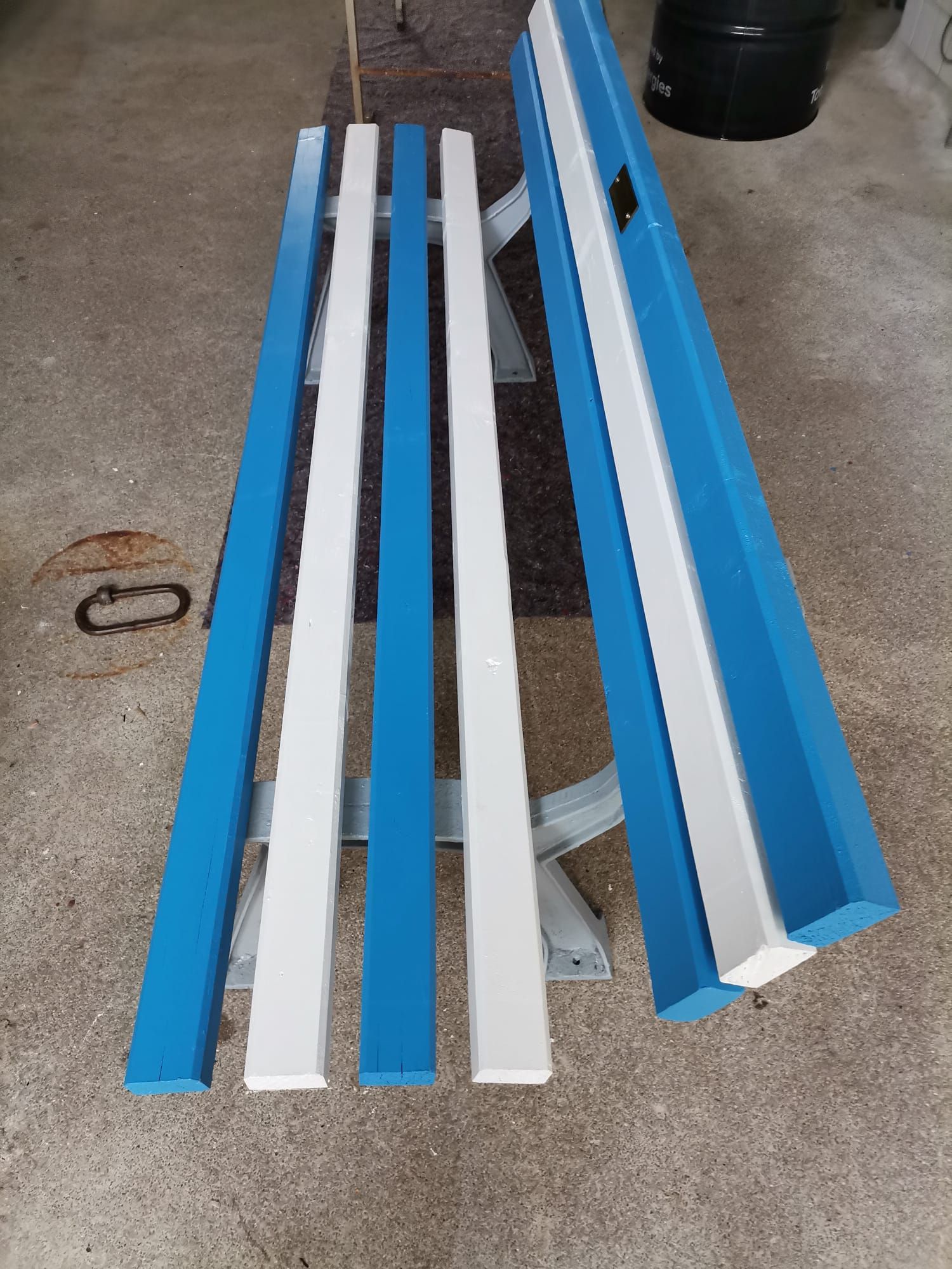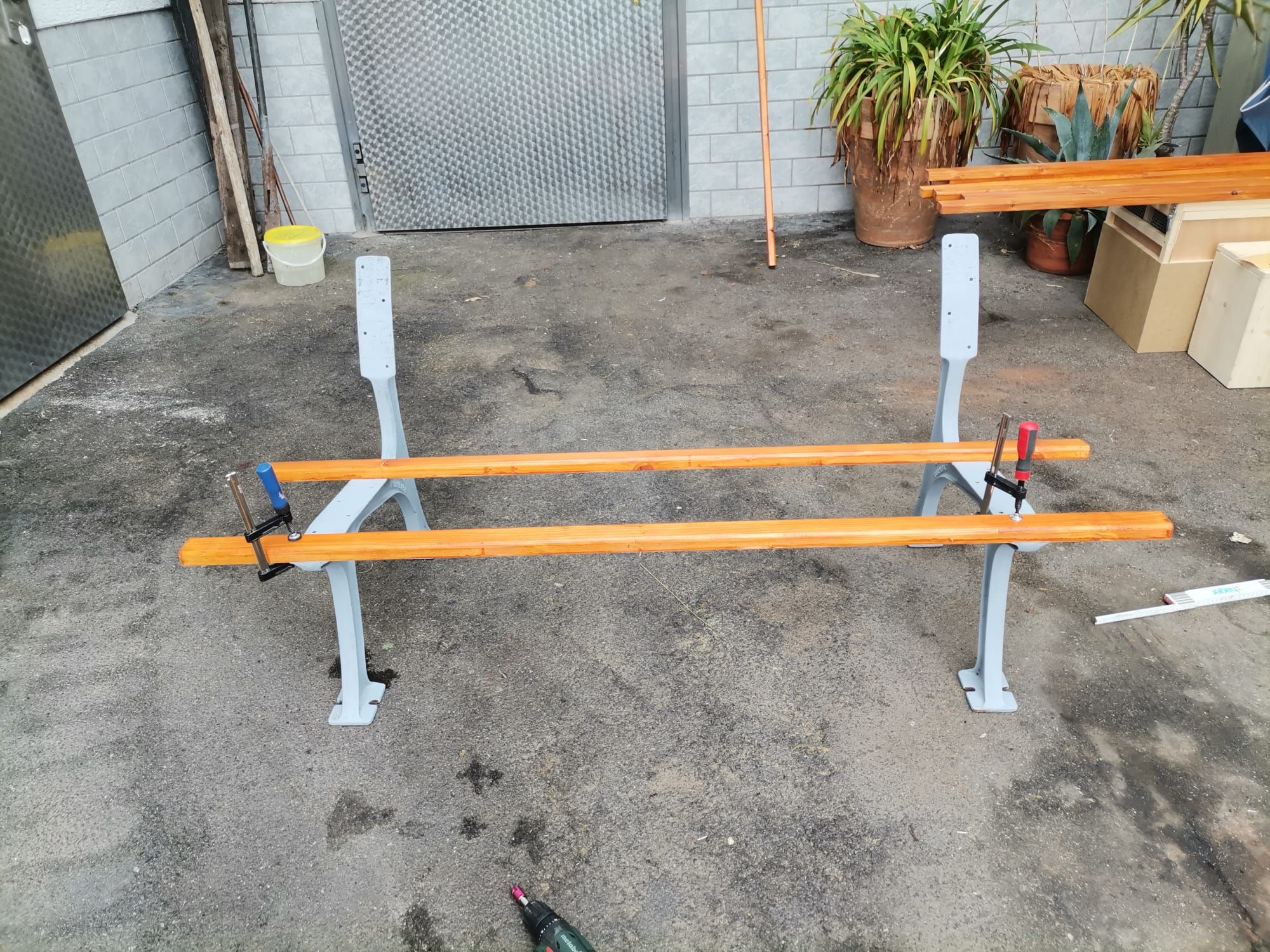 Auch etwas exotische Konstruktion werden demontiert, gesäubert, geschliffen und gestrichen. Wo es nicht mehr geht sägt und hobelt Jürgen neue Teile als Ersatz. Dann werden die Bänke wieder zusammengebaut und aufgestellt.