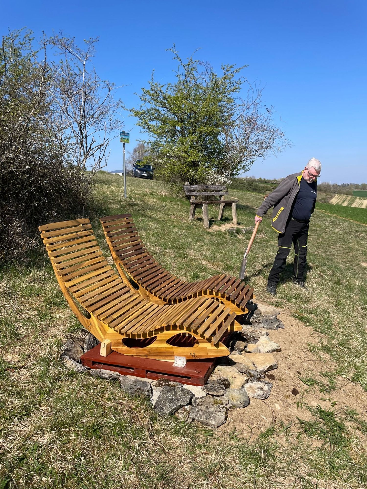 Der Wanderweg wurde an mehreren Stellen ausgebessert, mit Schotter aufgefüllt und planiert. Der Aussichtspunkt hat neues Mobiliar erhalten. Die Liegebänke laden zu einer gemütlichen Rast ein. Nach getaner Arbeit probieren Rainer und Jürgen die Liegen und testen ob die Aussicht so gut ist wie geplant. Die schöne Aussicht von dem Rastplatz "Schöne Aussicht" wurde für sehr gut befunden und bleibt auch so.
