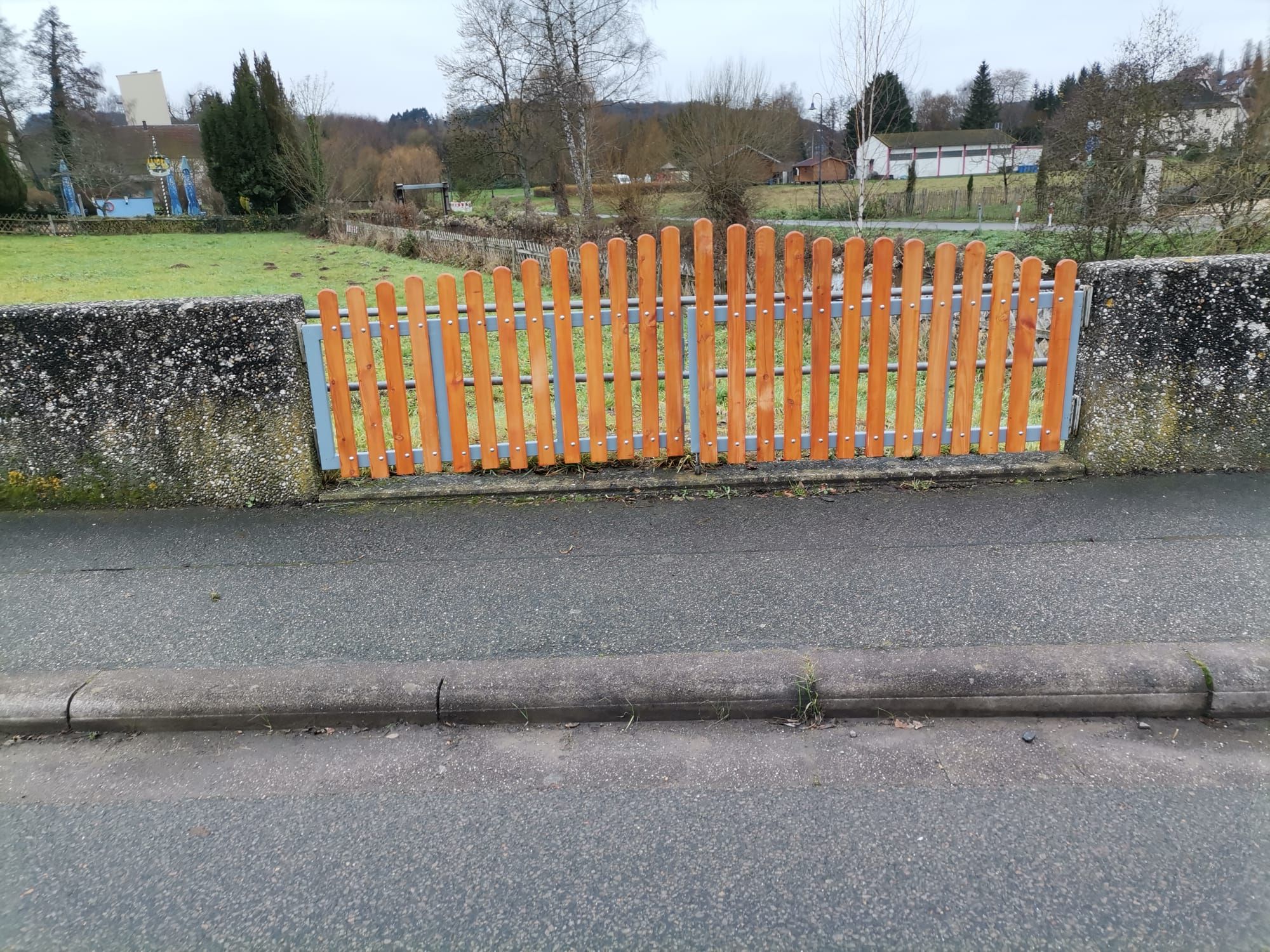 Das Tor zum ehemaligen Minigolfplatz beim Birkenhof sah schon ziemlich mitgenommen aus. Heute haben die Bankräuber das Seitentor mit neuem Holz versehen. Das Holz stammt von der Gemeinde, wurde bearbeitet von Siegfried Wittke und Jürgen Poller. Die Bretter hat Klaus gestrichen und mit Willi auf die beiden Seitenteile montiert und wieder eingebaut.