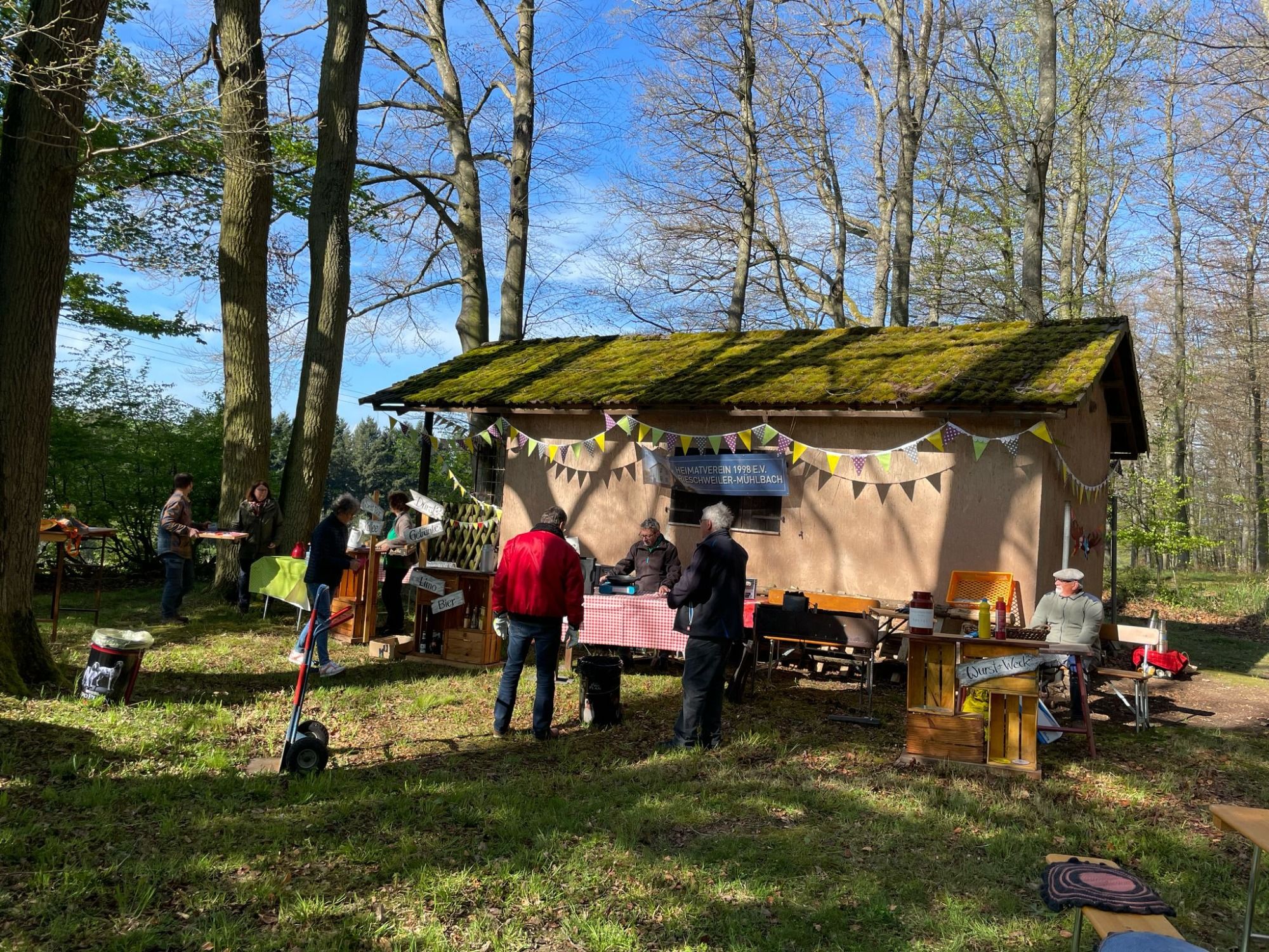Wie auf Startschuß: Um 11 Uhr trudelten die erste Gäste ein. Dann ging es toujour durch, die Freunde des Heimatvereins lassen sich auch nicht durch ungewöhnliche Zeiten abschrecken. Inzwischen stand die Sonne hoch am Himmel und unten gings heiß her. Um viertel nach 12 waren die 80 Portionen Grumbeersupp ausverkauft. Schnell Brot gekauft und die restlichen Würste mit Brot angeboten. Auch der Quetschekuche war bald alle.
