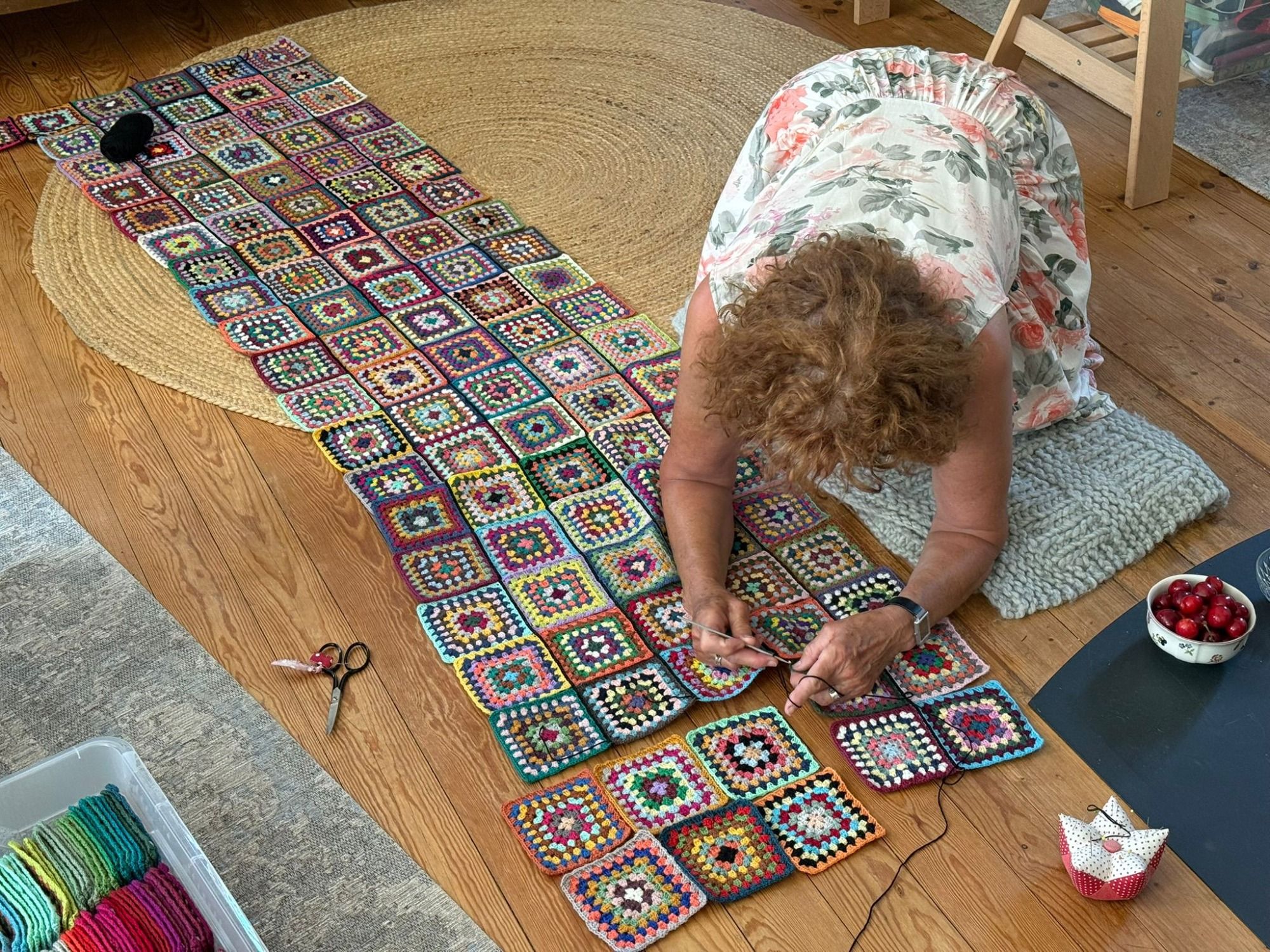 Unermüdlich hat Angelika 300 unterschiedlich farbige Quadrate, sogenannte Granny Square, gehäkelt. Gabi hat diese dann zu einer Kuscheldecke von 200 x 150 cm zusammengehäkselt.
