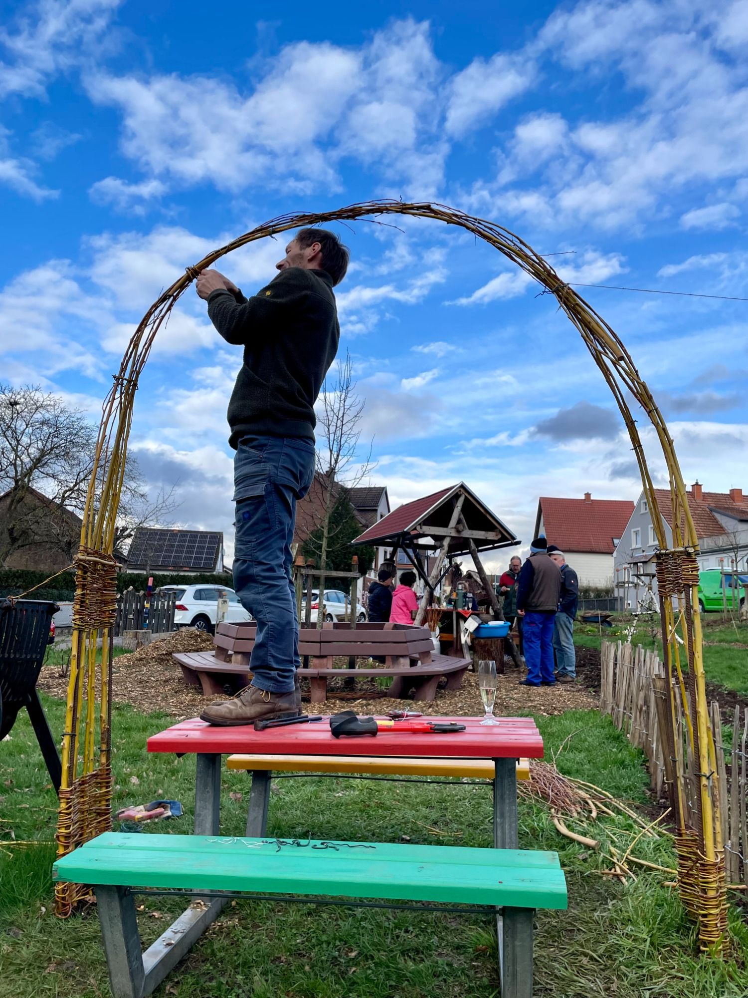 Die Weidenruten wurden gleich in Kränze gebunden, solange sie noch weich und elastisch sind. Im nächsten Jahr werden das prima Träger für jahreszeitliche Schmuckgebinde. Auch wenn die Natur langsam in Winterschlaf geht, der überdachte Freisitz am Platz der Vielfalt steht weiterhin jedem als Versperplatz zur Verfügung.