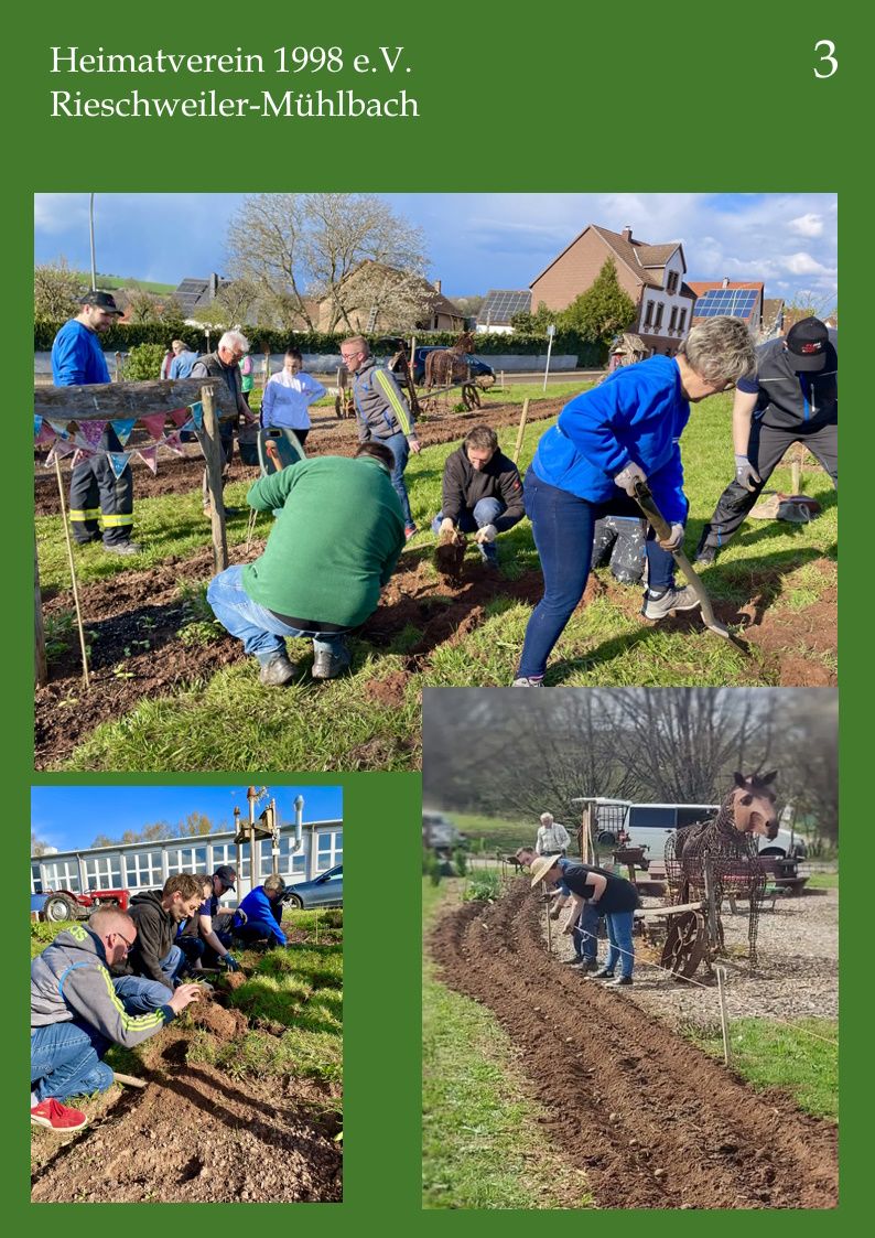 Das Ackerteam vom Heimatverein hatte zu seiner Kartoffelpflanzung am Freitag Nachmittag Hilfe der freiwilligen Feuerwehr Rieschweiler-Mühlbach. Die Jugendfeuerwehr mit ihren Ausbildern und Betreuern waren in diesem Jahr mit dabei am Platz der Vielfalt den Boden vorzubereiten und Kartoffeln zu setzen.