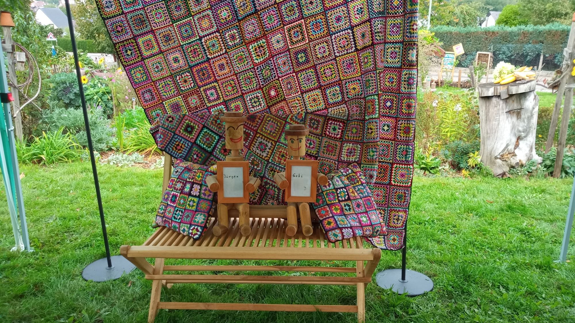 Als besonderen Gag haben sich die Damen vom Heimatverein vorgenommen, die Idee der Granny Square weiterzuspinnen und andere Artikel zu häkeln. Am Ackerfest wurden alle päsentiert.