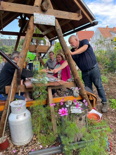 Der freitägliche Arbeitseinsatz am Platz der Vielfalt artet aus. Kaum ist die Arbeit geschafft wird geschlemmt.
