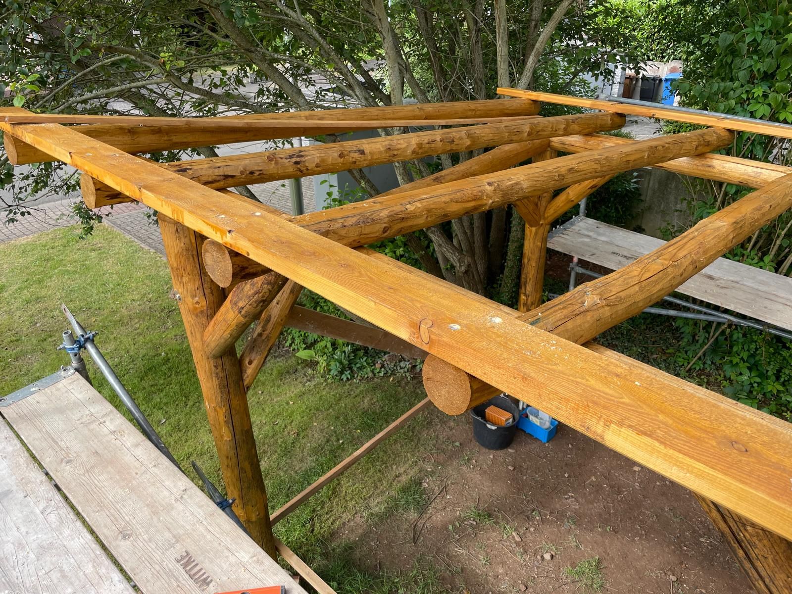 Jürgen lieferte das Holz bei der Werkstatt an. Zimmermann Wittke weiß wie das alles zusammen gehen muss und das sieht auch schon ganz gut aus. Da staunt der Laie und der Fachmann wundert sich.